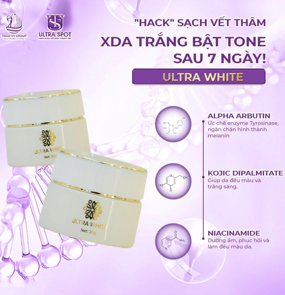 "Hack" sạch vết thâm – Da trắng bật tone chỉ sau 7 ngày! ULTRA WHITE – Bí quyết trắng sáng chuẩn spa tại nhà Với công thức độc quyền chứa 3 hoạt chất dưỡng trắng đỉnh cao: Alpha Arbutin: Ức chế enzyme Tyrosinase, ngăn chặn hình thành melanin – nguyên nhân chính gây sạm da. Kojic Dipalmitate: Giúp da đều màu, trắng sáng rõ rệt từng ngày. Niacinamide: Dưỡng ẩm, phục hồi và làm mịn da, cho làn da căng bóng khỏe mạnh. Chỉ sau 7 ngày – da bật tone, mờ thâm, mịn màng thấy rõ! Dòng sản phẩm được các spa và khách hàng tin dùng vì hiệu quả nhanh – an toàn – không bào mòn da. ULTRA WHITE – “Nhiệt tâm và uy tín làm nên thương hiệu”